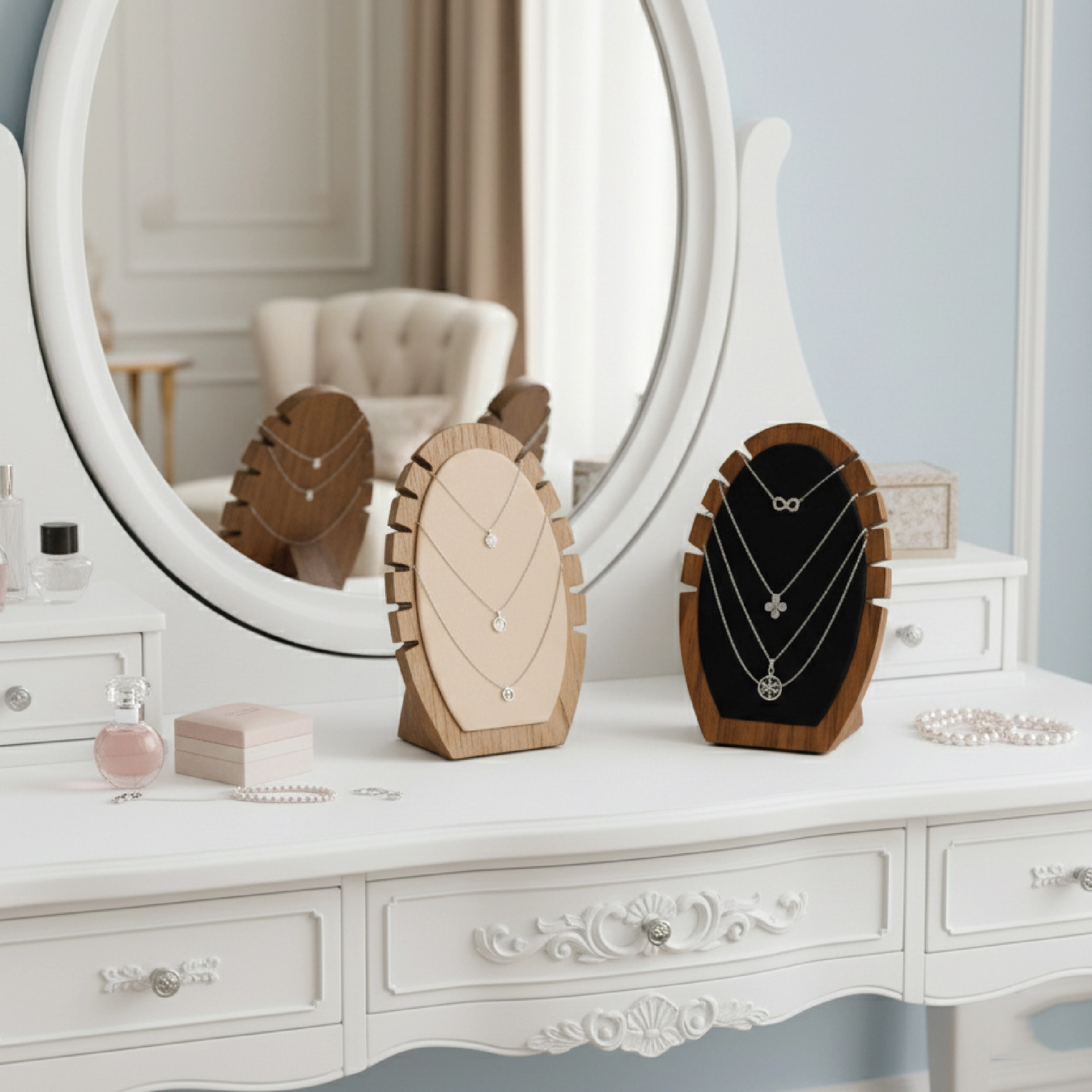 Crafted from high-quality wood, it offers both durability and beauty. The unique oval design not only enhances the look but also provides a practical way to display and access your jewelry easily.