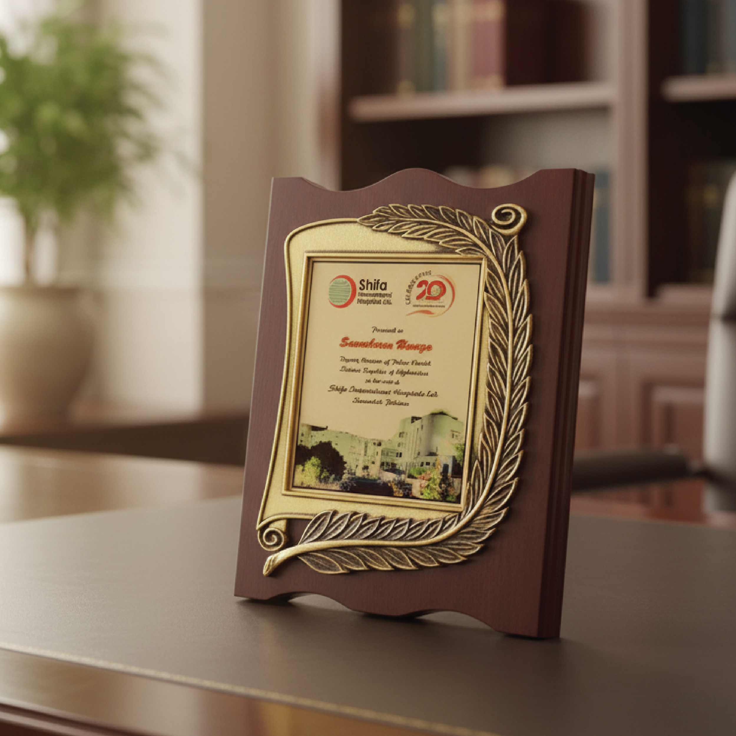 At the center lies a lustrous gold-finish metal plate, providing a premium canvas for high-definition color printing. The combination of rich wood tones and textured metallic elements makes this plaque an authoritative centerpiece for any executive office or professional gallery.