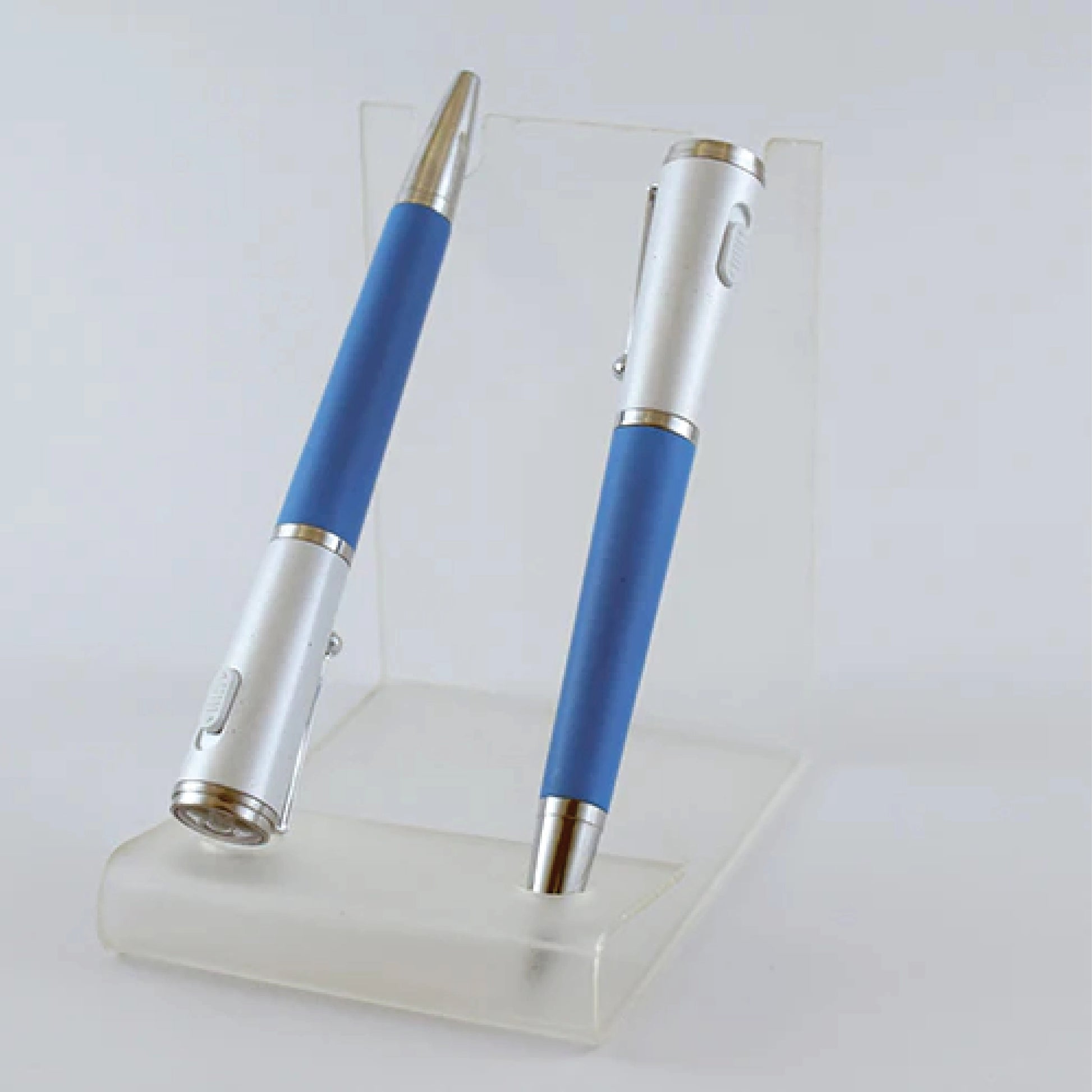 Add a modern and refreshing touch to your workspace with this Blue & Transparent Pen with Transparent Stand. The stylish combination of crystal-clear design and blue ink body makes it a perfect corporate or executive gift item.