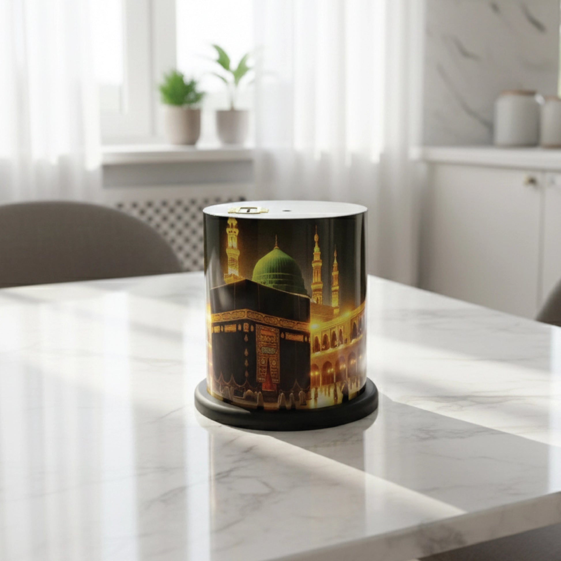 This dual-design box features elegant artwork of the Holy Kaaba and Masjid Nabvi, symbolizing devotion, patience, and blessings. Perfect for keeping your savings safe for pilgrimage or daily Sadqa.